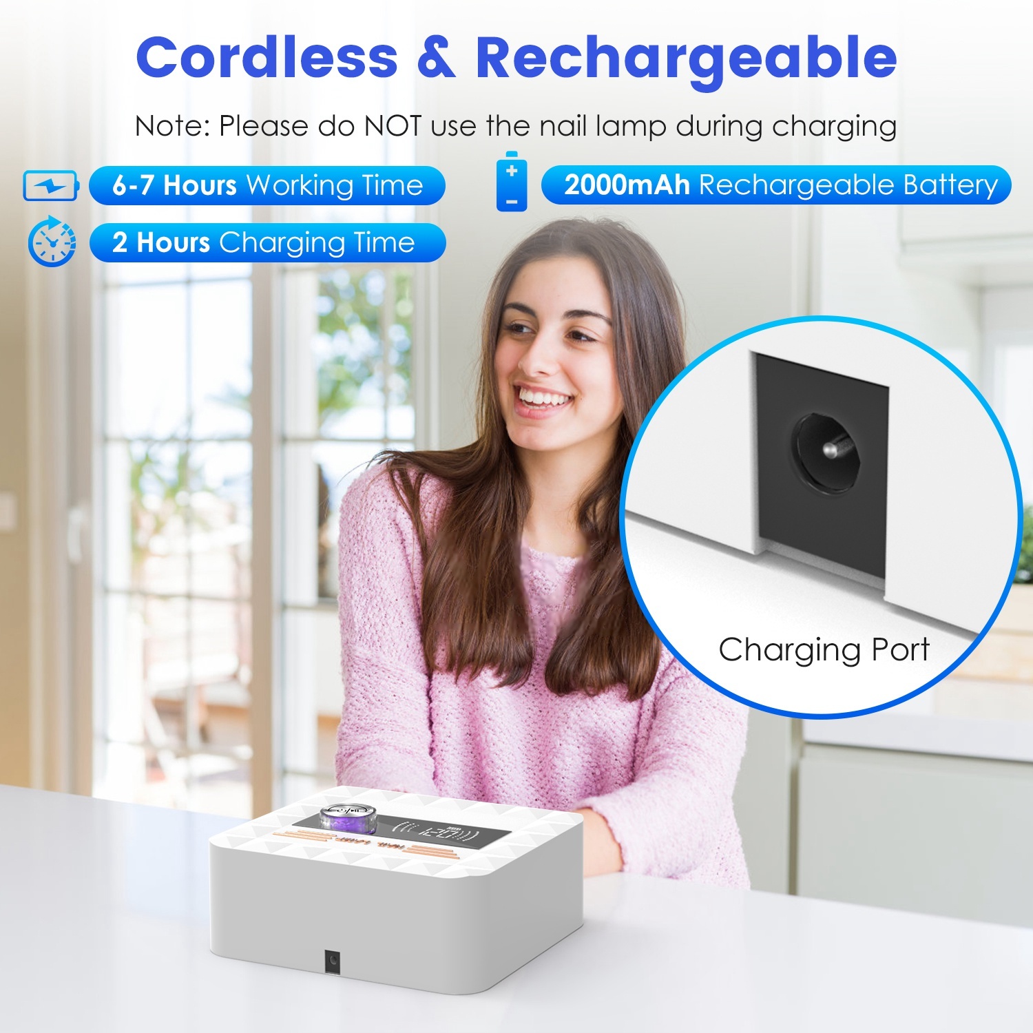 Do salon-speed gel manis anywhere—no outlet required. This lightweight, cordless nail lamp packs 120W of power and 30 UV/LED beads positioned across the top and sides, so color cures fast and evenly from every angle. Spin the timer knob to set exactly 1–120 seconds and watch the large LED screen count down—no guesswork, no overcure. The stainless-steel mirrored base pops off with hidden magnets for easy cleaning and better light reflection, and the opening is roomy enough for both hands or both feet. A built-in 2000mAh battery delivers hours of use between charges, complete with clear battery indicators and a soft “breathing” light around the dial for a calm, spa-like vibe.