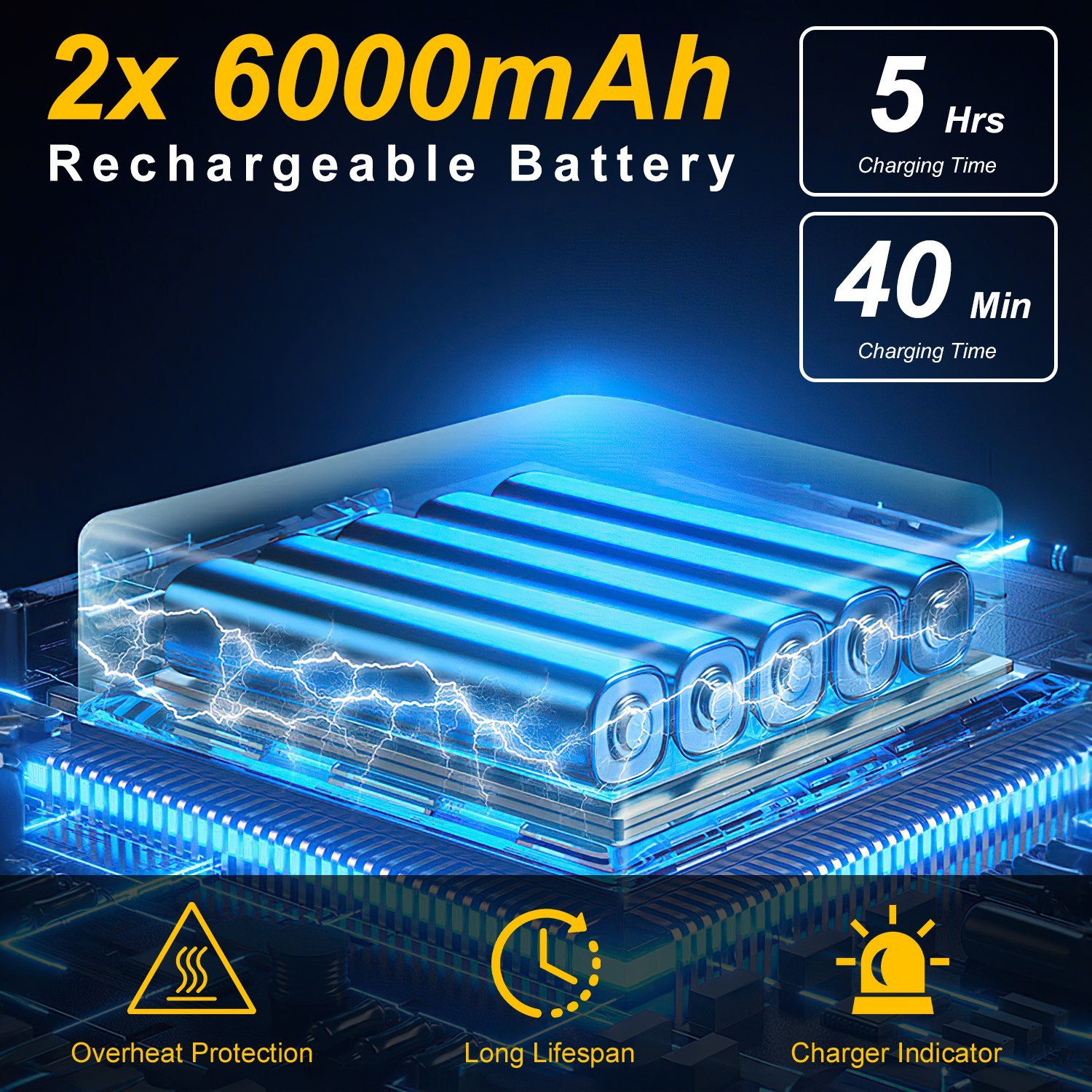 - Cordless freedom: Two 6000 mAh 21V packs give about 40 minutes total runtime (≈20 min each) and recharge between uses.
