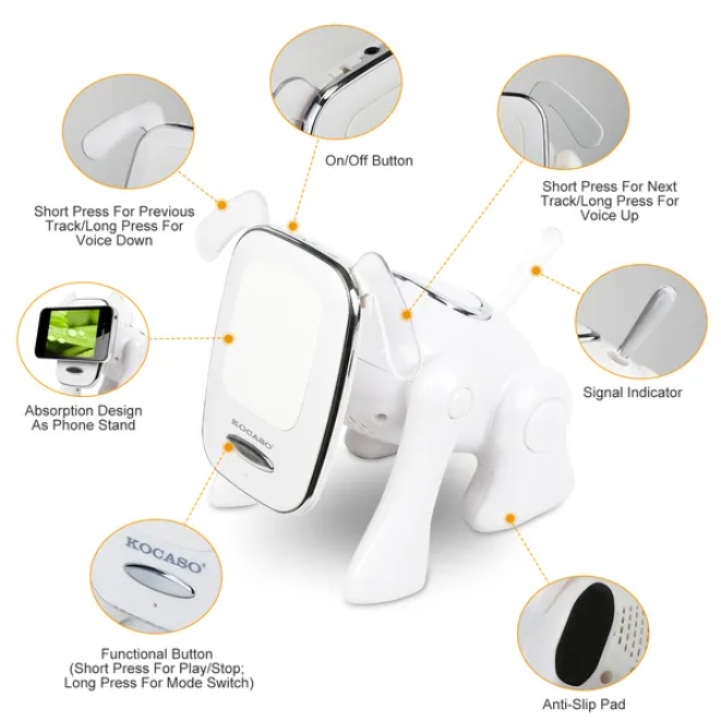 Small, fun, and surprisingly handy. This palm-size pup streams your music wirelessly, holds your phone up front, and even doubles as an FM radio. Toss it in a bag for a party or park day—the playful design is a conversation starter.