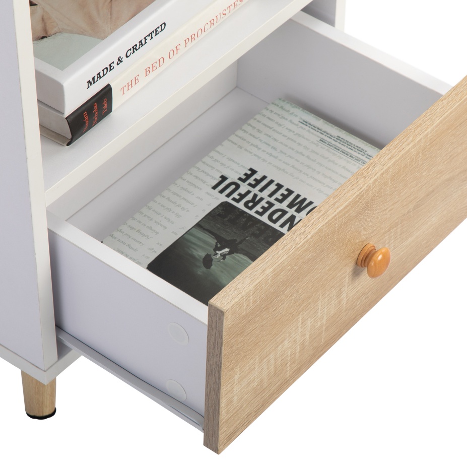 Clean, simple, and made to work in small spaces—this matching pair of bedside cupboards brings tidy storage to both sides of the bed (or the sofa). Each table pairs a smooth-gliding top drawer for nightly essentials with a closed lower compartment to hide books, chargers, and clutter. The wipe-clean PVC finish keeps the white looking crisp, while solid pine legs add a warm, sturdy base. At just 15.87″ × 11.89″, the footprint is slim enough for tight bedrooms, apartments, or dorms—but the 21.38″ height lands right where you need it for lamps and a glass of water. Use them as nightstands, end tables, or a small entry catch-all—same modern look, wherever they go.